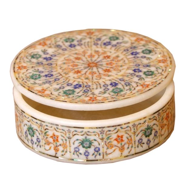 Marble inlay Storage Box Engraved with the beauty, here is a collection of aesthetic marble inlay jewellery boxes handcrafted with our set of experienced and creative craftsmen. Octagonal in shape, these jewellery boxes assist women in the storage of their ornaments and also their daily necessities and keeping them compiled at a sole place. These semi-precious stones studded jewellery boxes serve as a solo place for the collocation of the accessories. This would be a most lovable piece as a surprise gift for your moms and sisters too. mother, wife, daughter, girlfriend, friend, colleague. Additionally, Birthday, Wedding Day, Valentine’s Day, and Anniversary Day